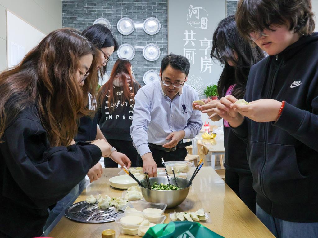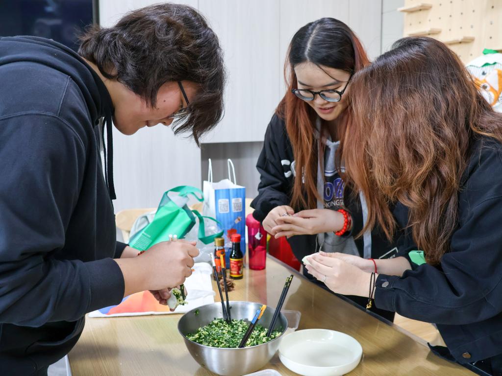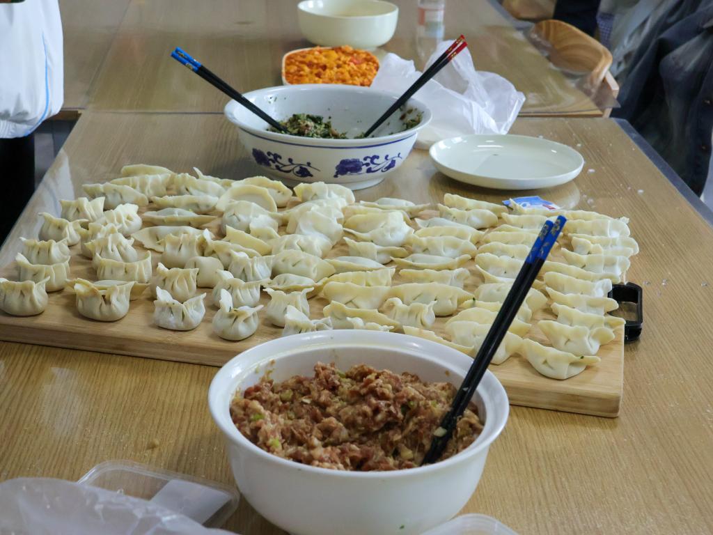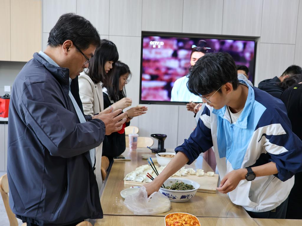 我院师生共同参与备餐、制作环节,气氛融洽。师生们分组协作包饺子,同学们争前恐后露一手,秀刀工、秀拼盘,还制作了烤蛋挞、拌凉菜、西红柿炒鸡蛋、青椒炒肉等家常菜,洋溢着“家宴”般的温暖氛围。