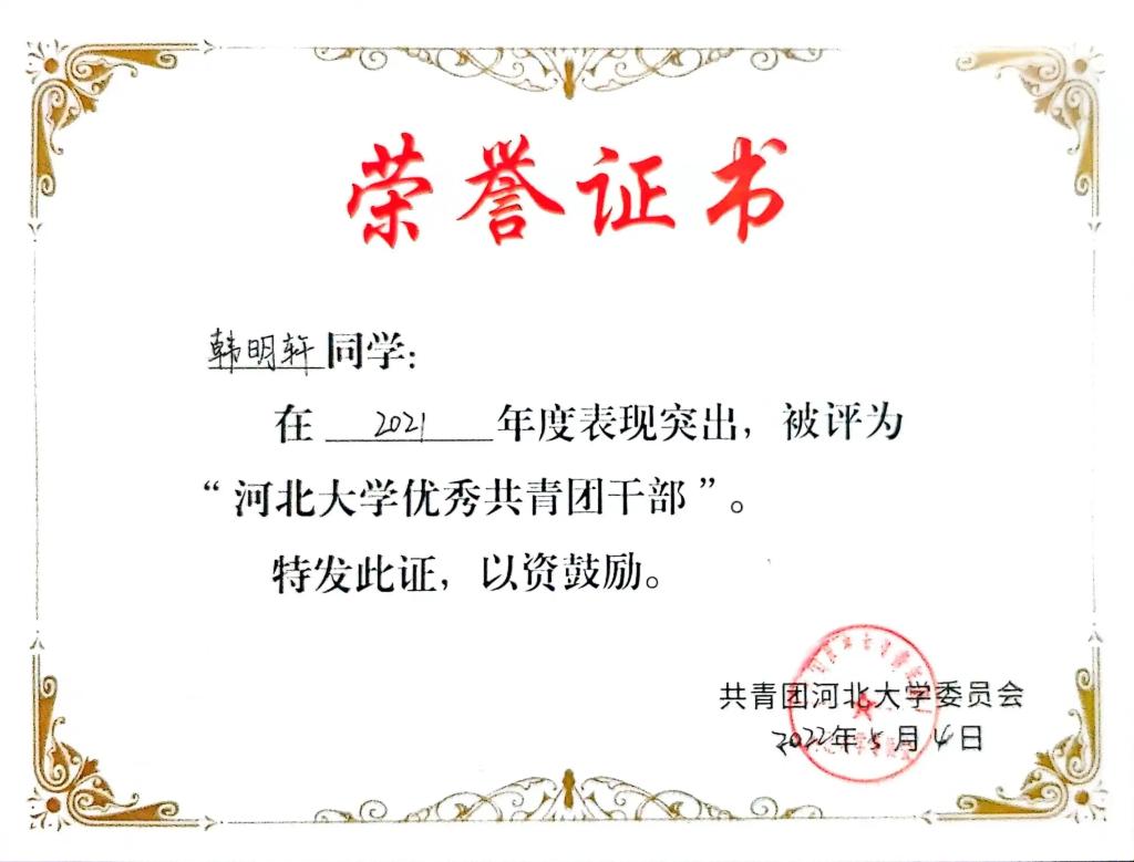 韩明轩,河北大学历史学院2021级历史学专业本科生,曾任河北大学历史学院辩论队队长,历史学院2021级历史学类一班班长等职务。现已推免至华中师范大学历史文化学院中国史专业。