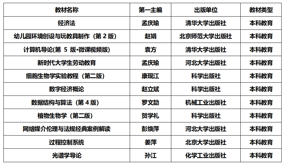 根据《河北省教育厅关于公布河北省“十四五”普通高等教育本科规划教材名单的通知》(冀教高函发〔2025〕45号),我校11部教材入选河北省“十四五”普通高等教育本科规划教材,具体名单如下: