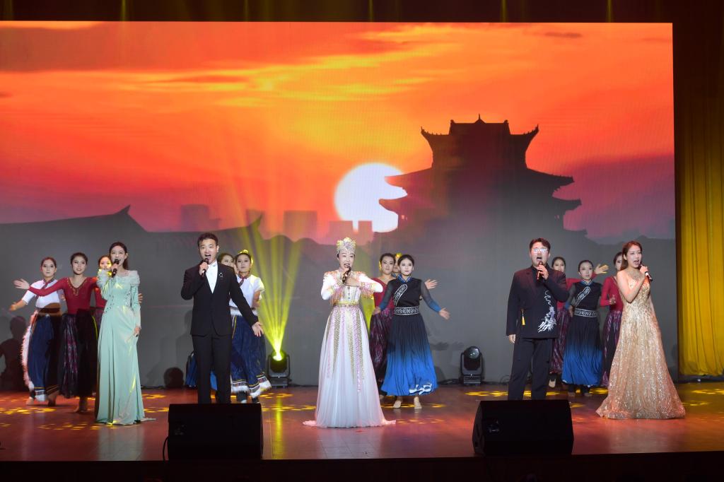 我校艺术学院师生精心编排了12个优秀文艺节目,包含合唱、独唱、舞蹈、器乐齐奏、合奏等多种形式。随着《篇章》高昂旋律的奏响,歌舞演出高潮迭起——《同心共筑中国梦》《这片土地》《山丹丹花开红艳艳》《把一切献给党》《保卫黄河》和男女生四重唱《领航》等一个个精彩节目热情讴歌党和国家事业发展取得的伟大成就,中国古典舞《礼·呼也》、三重奏肖斯塔科维奇的《第二圆舞曲》、二胡齐奏《光明行》和羌族女子群舞《生生不息》、壮族舞蹈《绿水青山间》以优美的旋律和舞姿展现祖国大好河山和人民幸福生活。演出现场掌声一次次热烈响起,伴随着全场齐声高唱《歌唱祖国》,文艺演出圆满落下帷幕。