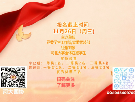 为进一步促进我校精神文明建设,将爱国主义教育贯穿学校教育全过程,丰富和活跃师生文化生活,歌颂伟大的革命,伟大的党,伟大的祖国,鼓舞人心,凝聚力量,决定举办河北大学2025年度“弦歌不辍赞祖国 韶华逐梦续荣光”红歌大赛。