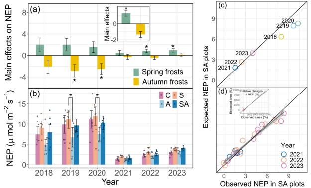 在整个生长季中,春季霜冻能促进生态系统碳固定(NEP呈正值),而秋季霜冻则促使生态系统碳排放(NEP呈负值),两者同时出现时,整个生长季的碳收支基本相互抵消,近乎为零。该研究首次阐明了霜冻事件的持久性影响及季节性差异,量化了霜冻在生态系统尺度碳收支方面的影响机制,为预测未来气候情景下的霜冻引发的碳排放提供了重要依据。