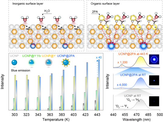 近日,物理学院发光与显示课题组在表面重构诱导宽温域上转换发光增强领域取得重要进展,相关工作“Bright upconversion over extended temperatures enabled by an organic surface layer”以河北大学为第一单位发表在《Nature Communications》(2025,16, 3249)。索浩博士为论文的第一兼通讯作者,硕士研究生赵沛航为共同第一作者,香港城市大学王锋教授为共同通讯作者。