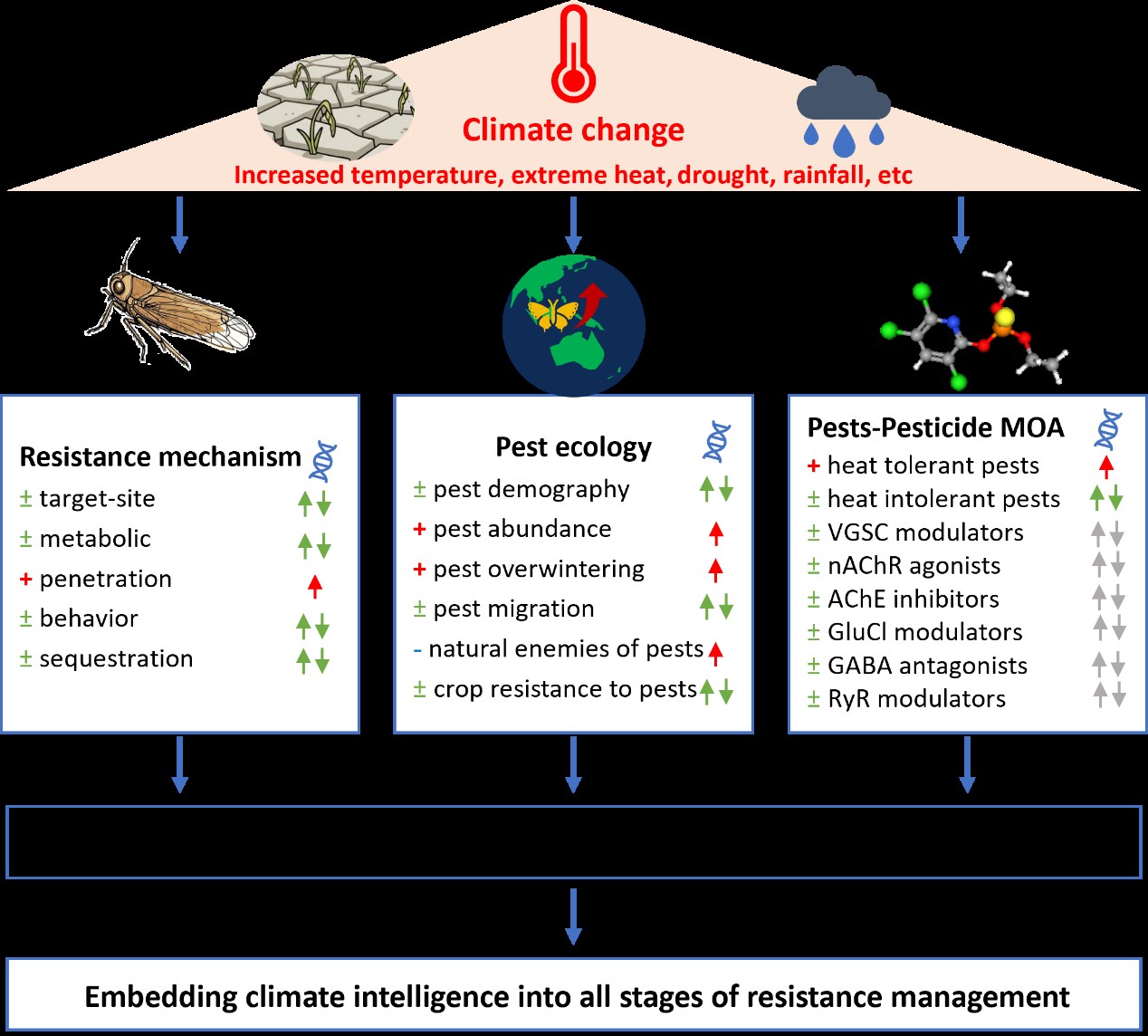 图1气候变化对抗药性机制、害虫生态学及农药作用方式的影响示意图,以及这些影响如何塑造杀虫剂抗药性进化
