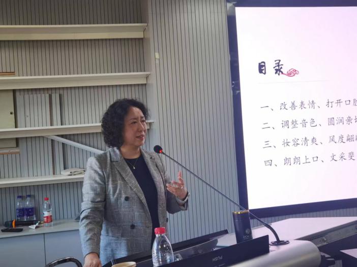 2024年10月10日下午,文学院特邀新闻传播学院播音主持系主任、河北大学教学名师李亚虹教授做讲座:《教师口语表达》。文学院30余名教师参加了此次讲座。讲座从改善表情、打开口腔,天正银色、圆润亲切,妆容清爽、风度翩翩,朗朗上口、文采斐然等四个方面讲授了教师如何更好的在课堂上进行口语表达。