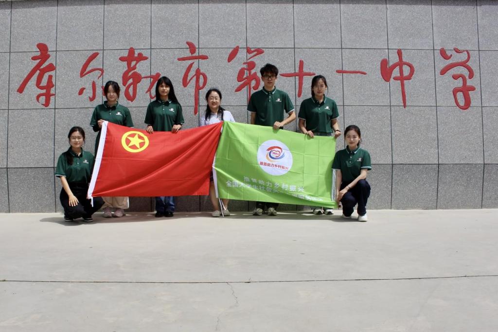 (图为:“童心同语”大学生实践团队部分成员与指导教师李彦洁在第十一中学合影)