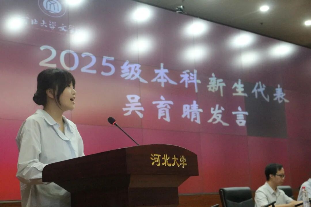 2025级中国语言文学类专业吴育晴作为本科新生代表发言,她表示将珍惜在河北大学的学习机会,以金秋相逢为序曲,与大家一起实现理想,书写青春!