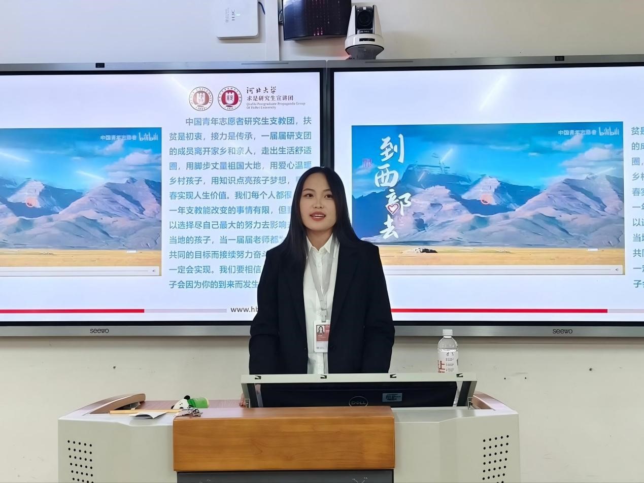 王婧洋首先介绍中国青年志愿者研究生支教团发展历程,该项目27年来组织全国200余所高校3.1万余名志愿者赴中西部支教,河北大学20年间也累计派遣275名志愿者前往青海、贵州等地,践行志愿服务精神。作为学校第25届研支团成员,她详细讲述2023年7月至2024年7月在青海省海南藏族自治州共和县江西沟镇民族寄宿制小学的支教生活,期间承担科学、道法课程教学,开设多类第二课堂,并以少先队大队辅导员身份组织丰富活动助力学生全面发展。她还分享了“书香伴读”母亲节活动、“云游河大”、“架起跨越云端的虹桥”及“同梦同行千人助学计划”等温暖片段,这些经历让她深刻理解“青年当有志,立志在四方”的意义,也以实际行动证明个人付出能为山区孩子点亮梦想、为基层教育注入活力,为在场学员传递了服务基层、奉献社会的价值导向。